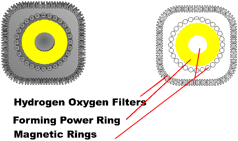 So, how are the things made in the first place? Like I said I am for the machine theory and so my diagram and this thesis I am about to put across are based on that. First of all, where does the machine get its power from? It gets it from the power stone contained within it. This is probably a magically based mineral which not only produces high outputs of energy but also aids the production of exotic matter It's internal make up is probably atomic. The ring machine only makes a ring about once every ten hours. This was predefined by Uncle Chuck. He probably did this to avoid a strain on the machine which cannot handle too much energy at once. When the right charge is stored a powerful magnetic field is produced and fast moving ionized particles taken from the water are forced into it and form lattices by themselves. At the same time a charge is also passed into it by ion beam. The inside of the ring now is made of fast moving highly charged antimatter. It is plasma. The outside of the ring is formed by producing a wall of various particles that are held together by the attracting force of the ring's energy.