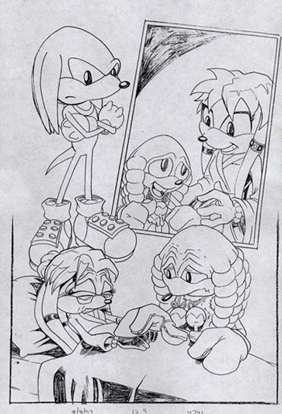 Athair then starts bringing the story up to date by saying that there was one difficulty from which he could not protect the Tribe: a big, fat difficulty with a bad moustache. An attack on the tribe by SWATbots left several members, including Athair's mate, Crystal-Light...er...Crystal-La, meeting the same fate as Uncle Chuck and countless other Mobians. But the Tribe has endured, while Athair has occasionally free-lanced at the bidding of the Walkers (including his guest shot in the Tails miniseries, "Southern Crossover," where we first met him). Knuckles says he has a lot of questions, but goes to bed instead.